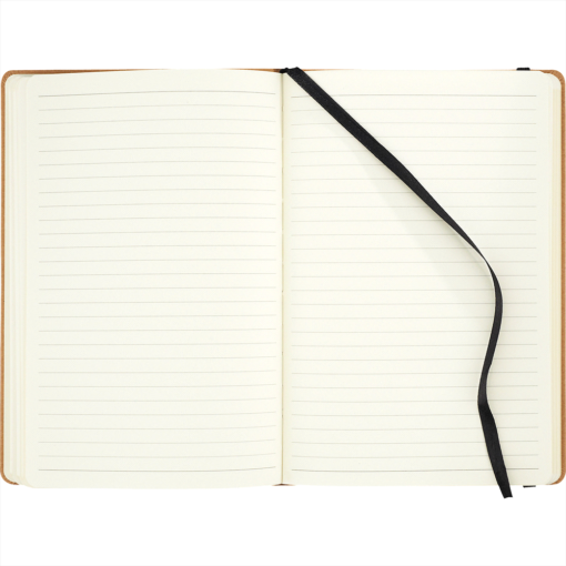 The Cumbria Notebook: A medium-size notebook featuring a stylish cork and PU hard cover, 80 leaves of lined cream paper, bookmark ribbon, and elastic closure band. customisable with various decoration options.