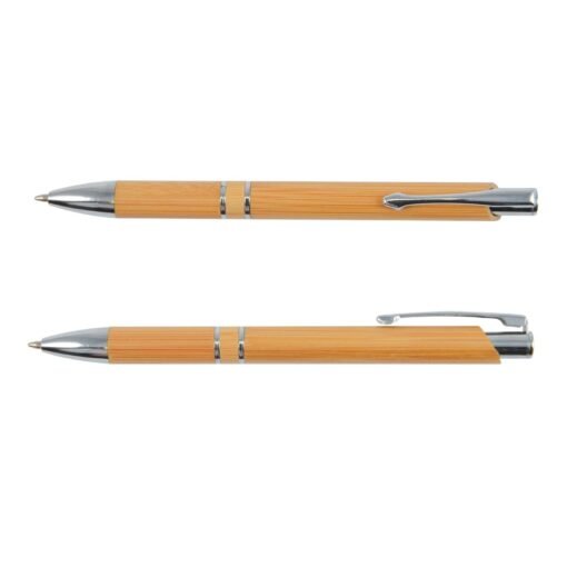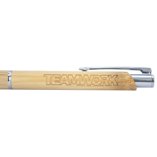 Bamboo pen with push-button design, eco-friendly bamboo barrel, and metal clip. Personalise with logo or brand name.