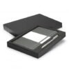 Trendy gift set which is presented in a smart black gift box. It includes a medium size Alexis Notebook and a retractable aluminium Centra Pen. The notebook has an attention-grabbing hard cover which is finished with a stylish combination of heather style PU matched with leather-look white PU. It has 80 leaves (160 pages) of 80gsm lined cream paper, an elastic closure band and a bookmark ribbon. The pen has a matt anodised barrel and shiny chrome accents. It has a black refill with 800 metres of writing ink and the barrel laser engraves to an oxidised white colour.