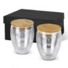 Stunning set of two 350ml Azzurra Glass Cups. These premium cups are made from double-wall, shatter-resistant borosilicate glass and feature a natural bamboo lid with a silicone seal. The cups are presented in a premium black gift box and are an elegant gifting solution.