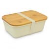 The Bambino Lunch Box: An eco-inspired lunch box made from a unique blend of natural wheat straw fiber and BPA-free polypropylene, featuring a bamboo lid and presented in an unbleached cardboard gift box. Decoration options available: Pad Print, Direct Digital, Laser Engraving.