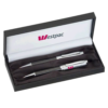 This popular ballpoint carbon fibre pen has a delightful woven patterned fabric captured under the glass. Available in matt silver finish. Supplied with black ink.
