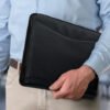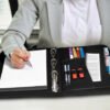 Professional portfolio manufactured from PU with removable metal ring binders. It features a zippered closure for added security and convenience. The portfolio also includes internal loops for pens and flash drives, as well as large document slips and three business card holders.