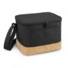 Smart 6L cooler bag with PE foam insulation encased in a water-resistant PEVA inner liner. The outer construction is 600D polyester with a stylish natural cork accent panel around the base. It has a zippered top closure, a slip pocket on the front and an adjustable woven shoulder strap.