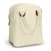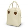 Stylish lunch bag made from robust 450gsm cotton canvas with PE foam insulation and a water-resistant PEVA lining. The cotton carry handles have leather-look PU accents, and the bag has a zippered main compartment with a slip pocket at the front.