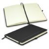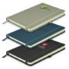 The Columbus Notebook: A sophisticated medium-size notebook featuring 80 leaves of lined cream paper, a hard cover with a woven PU finish, and convenient accessories like an elastic closure band, bookmark ribbon, and pen loop. Available in grey, navy, and black, with branding options including Pad Print, Screen Print, and more.