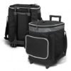 Large 24L trolley cooler bag with a two-stage pull up handle and robust dual wheels. It has thick PE foam insulation encased in a water-resistant PEVA inner liner and the outer construction is 600D polyester with decorative ripstop nylon trim. Other features include a zippered top closure, two large side pockets, a large zippered front pocket, woven carry handles with a Velcro cuff and trendy elastic lacing which is ideal for holding a sweater or light jacket.