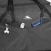 Exterior pockets with organisation. Padded handle wrap. Grab handles for easy handling. Adjustable padded shoulder strap. The main compartment capacity is approximately 100 litres.