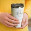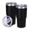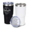 Large 550ml double-wall, vacuum insulated stainless steel tumbler and a stunning powder-coated finish which will keep drinks hot for hours. It has a secure push-on lid with a splashproof sliding closure. The tumbler laser engraves to a shiny steel finish. The tumbler is BPA-free and is presented in a black gift box. This product is not dishwasher safe and handwashing is recommended.