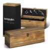 Stunning wine gift set in a natural acacia wood presentation box with a secure swing clasp closure. The box has foam cushioning with a fabric lining to fit and protect a range of wine bottles. The gift set includes a foil cutter, wine aerator, wine stopper and a corkscrew. The aerator, stopper and corkscrew are all made featuring acacia wood. This sophisticated gift set is presented in a natural gift box with a Keepsake branded sleeve.