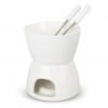 Mini ceramic fondue set that includes two stainless steel serving skewers with polypropylene handles. Simply melt cheese or chocolate in the fondue bowl using a tealight candle for heat, and dip various treats into the bowl using the skewers. This novel fondue set is sure to provide engaging entertainment for guests at dinners or parties. The set includes a tealight candle holder, a bowl and two skewers. Tealight candles are not included.