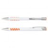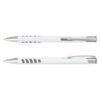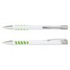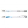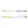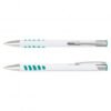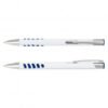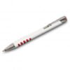 Retractable aluminium ballpoint pen with a painted gloss white barrel, shiny chrome accents and a coloured silicone grip with matching end cap. It has a large volume refill with 1200 metres of black German manufactured Dokumental ink. Panama can be presented in an optional pen sleeve or a gift box.