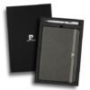 Stylish notebook and pen gift set. The notebook features 80 leaves of cream lined 80gsm paper and has a thermo PU cover with a elastic band closure with a branded metal slider. Accompanying the notebook is a twist-action brass ballpoint pen with shiny chrome trim, and 4000m of black Dokumental ink. The notebook and pen are presented in a Pierre Cardin gift box