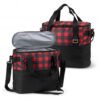Large 19L cooler bag made from robust 600D polyester with a stylish checkered pattern. The zippered main compartment is insulated with PE foam encased in a water-resistant PEVA inner liner. It has woven carry handles, a handy bottle opener attachment, an adjustable shoulder strap, and a slip pocket.