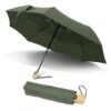 Compact 54cm, triple-folding umbrella with an eight-rib frame and automatic opening and closing. The eight-panel canopy is manufactured from 190T rPET (recycled PET) pongee, produced by recycling used water bottles and food packaging. It has 54cm fibreglass ribs and a steel shaft and folds down to a compact 28cm. It has a matching pongee sleeve and a Japanese Oak wooden handle. Compact