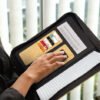 Modern A4 Portfolio, manufactured from cork with a zippered closure. Other features include a lined paper pad, a pen holder, six business card slots, a pocket for notes, and a large slip-side pocket for documents. When the cork is harvested only the outer bark is removed from the tree. This allows the tree to continue growing and replenishing the bark. It also has the benefit of a comfortable soft-touch texture while being very durable. The portfolio is presented in an unbleached kraft cardboard sleeve.