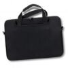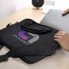Secure neoprene laptop bag with stowaway carry handles and a removable shoulder strap, meaning the bag can also be used as a laptop carry sleeve. The bag features a plush lining for added cushioning and a pocket divider to accommodate devices of various sizes. Using neoprene in the bag’s construction provides extra protection and water resistance.