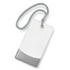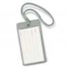 A sturdy luggage tag with an address panel on the reverse and a woven strap for attaching it to cases and bags.