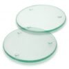 Set of two round glass coasters in a stylish black gift box with a window to show off the brand. The coasters have three non-marking polyurethane pads on the base. The branding is on the underside of the coaster and handwashing is recommended.