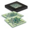 Set of two square glass coasters in a stylish black gift box with a window to show off the brand. The coasters have four non-marking polyurethane pads on the base. The branding is on the underside of the coaster and handwashing is recommended.