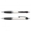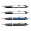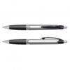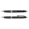 Retractable plastic ballpoint pen with a metallic barrel and a soft rubber grip. It has a blue refill with 1200 metres of writing ink.