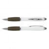 Twist action plastic ballpoint pen with a white barrel, a frosted translucent soft-touch grip, shiny chrome trim and a stylus. It has a black refill with 600 metres of German manufactured Dokumental ink.