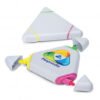 Set of five different coloured highlighters in a stylish plastic case which has a very large branding area. The spring-loaded clip holds the highlighters securely and when flipped open it doubles as a handy desk stand.